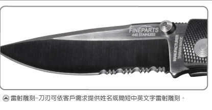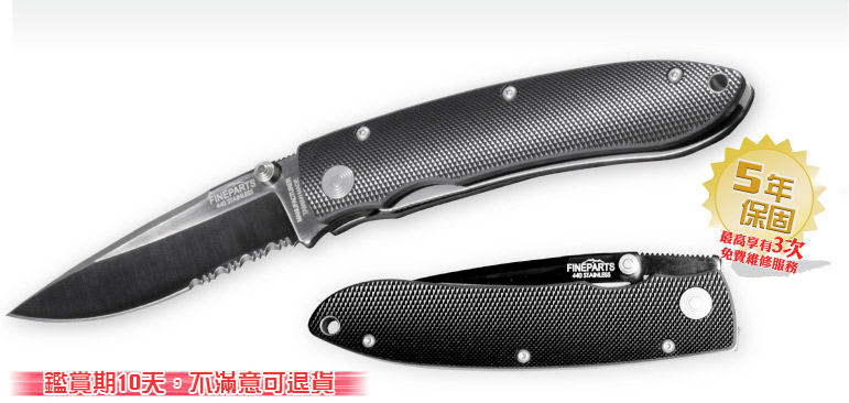 Fineparts首推此款不銹鋼鍍鈦小折刀〝Phantom幽靈〞。擁有許多實用的特色,是新一代野外生活家時尚與品味的最佳選擇。刀刃使用440stainless製造,鍍以耐酸鹼抗腐蝕黑色鈦面堅實耐用,半齒狀刀刃設計,更可以輕易割斷任何難纏的繩索,順利脫困。