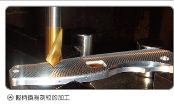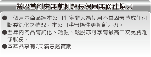 刀柄護手為航太級鋁合金硬質黑色陽極處理,膜厚達30百萬微米,刻以鑽石切面斜紋,經年使用依然常保如新,精密的安全卡榫,擁有如直刀的穩定品質。
